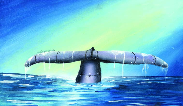 Thanks Splat here is a new addition for this week. Sorry about my delay for this week, I was a little busy with some commissions I had to do for people at work. Anyway, This one I call it "The Mechanical Whale's Tail". I haven't yet decided on if this will be a concept to my story but its cool anyway. It tells a story in itself such as if we keep hunting whales to extinction, then in the future we may have to replenish earth's oceans with the mechanical whales as crazy as that may sound. The Mechanical Whale is a sci-fi element that was inspired by my father in-law who gave me this idea for a painting. I painted in the background but I did not know what this piece was going to be. I didn't want to make this complicated. I wanted a simple idea with a twist and my father in-law said add in a whale's tail. I was like what thats just boring where is the twist in that? So he then said make the whale's tail mechanical or made out of metal and people can run wild with the idea and come up with what ever story they want about it. So that was my twist a Mechanical Whale's Tail.