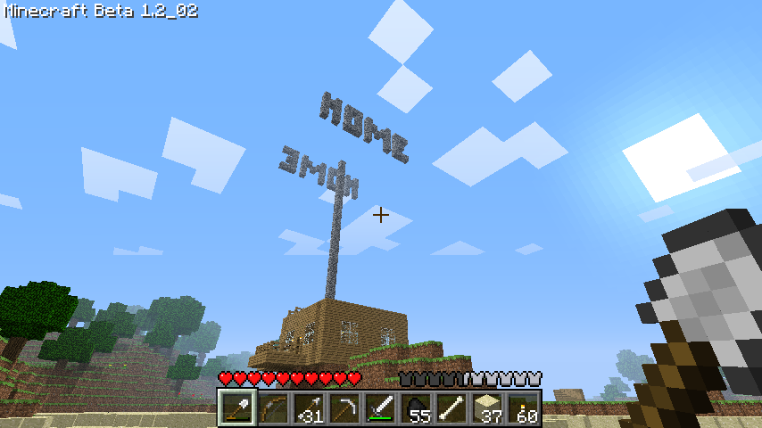 I died many times getting these words in the sky. (I quickly discovered that you can jump and place blocks below you and get as high as you want that way - Gravel and sand collapses if you remove the bottom block, so if you fall and die it's easy to remove your pillar after you respawn)
