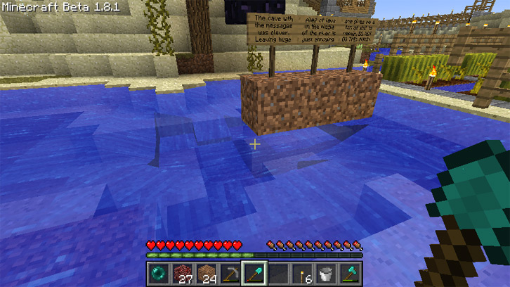 I logged on about 45 minutes ago to find a large pile of lava in the middle of the river with a sign warning that "More will be coming, you have been warned". When I got rid of it, it left this hole in the water: