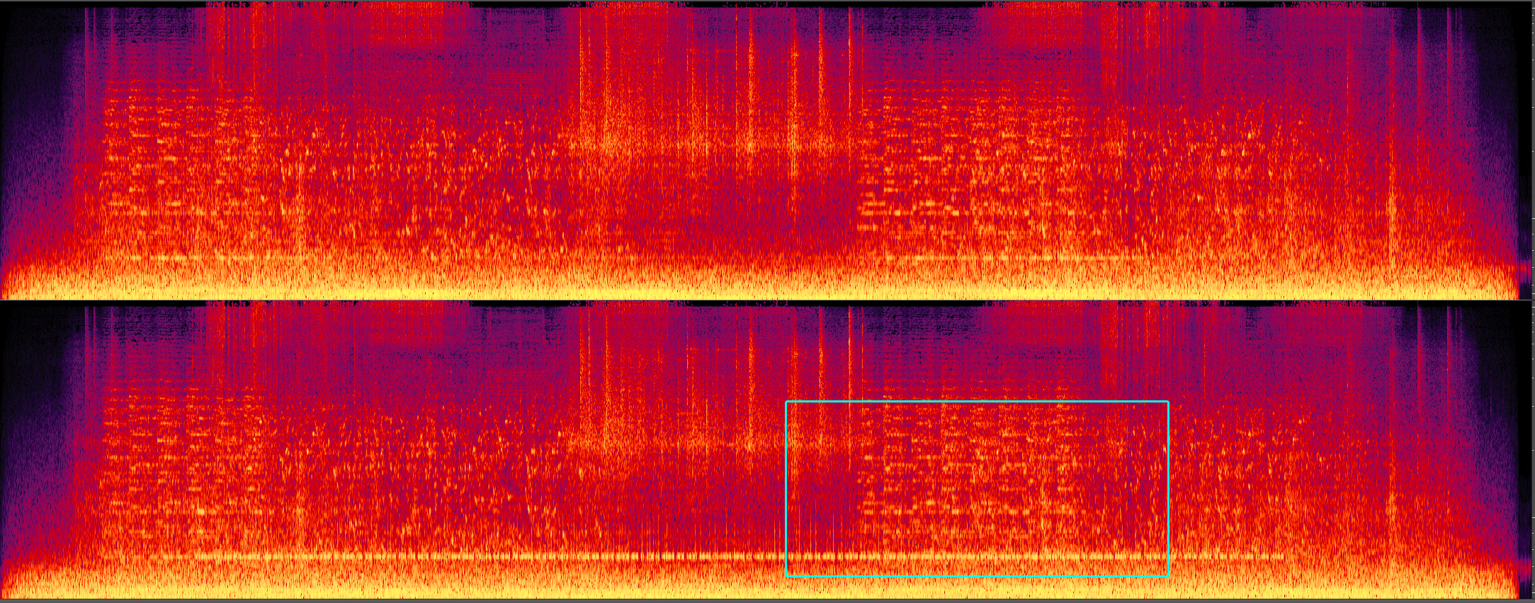 edit2: Attached better isolates of the forwards & reversed morse code spectro for comparison to by-ear decodings. These can be read as dots and dashes and contain only the right channel audio as the left channel does not have morse on it. If the WPM is constant, lines could be inserted into the image at a constant interval in order to determine word breaks.