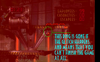 When I get to RuptureFarms II, the ring in Zulag 1 (which reveals a secret passage) is gone, as well as the one at the end of the Board Room. This glitch is so bad that it stops you from finishing the game, and can only be avoided by using the level select cheat.