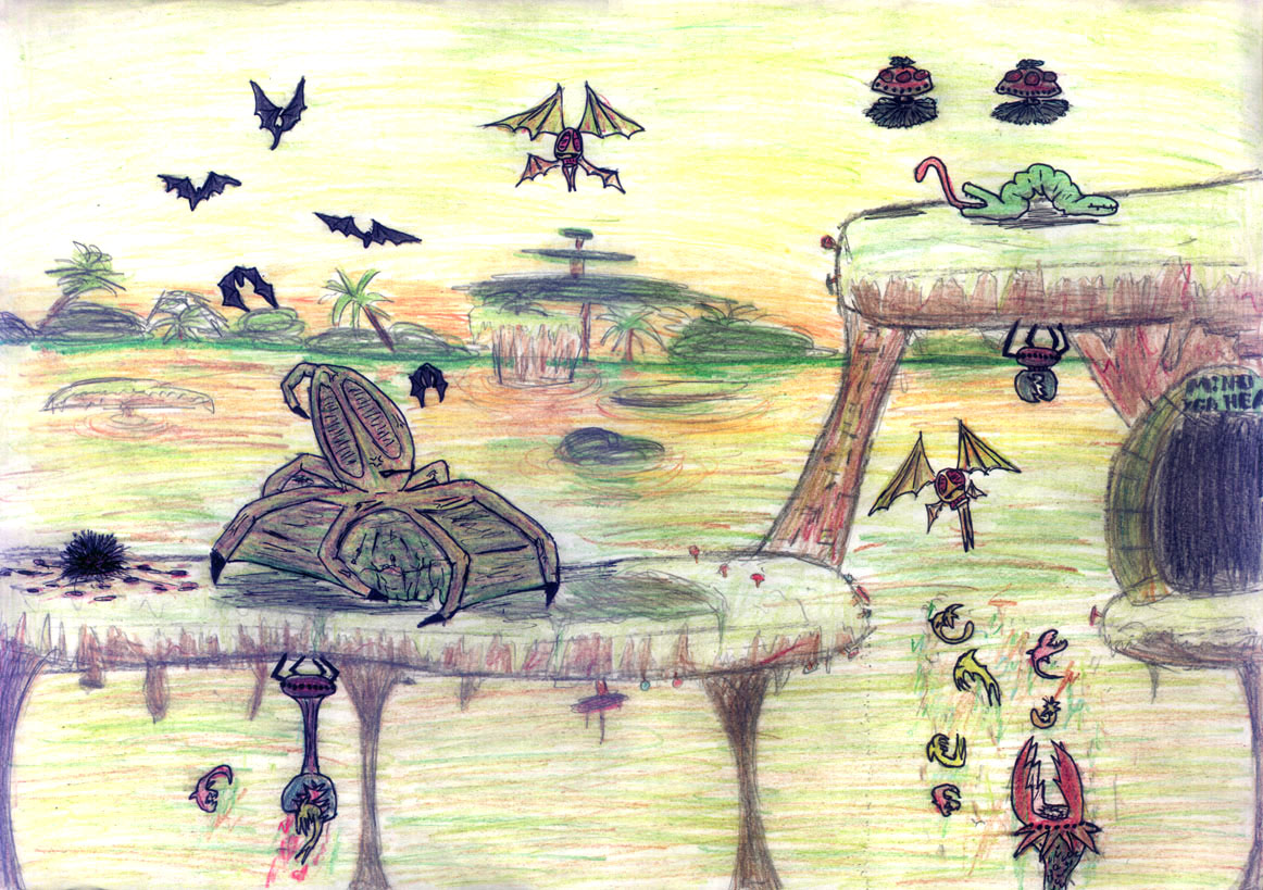 Another species is my first sentient Oddworld creation. I've not got a name for them yet, but they've got Vykker-ish heads, althuogh the top goes into 2 long bulbous lumps, kinda like two Vykker foreheads stuck together. The head however is medium sized at the jaw, then goes thinner at the eye area, then goes out when we come to the dual forehead. They have slitlike, catlike eyes, normally yellow or red, and have tiny round mouths. They've got 2 spindly, bony arms ending in 4 long, sharp, bony fingers, and their build is weird, their upper chest are fairly wide, yet again bony (Ribs showing etc.), while their stomachs are narrow. They have 4 legs, 1 left, 1 right, 1 front, 1 back. They wear black waistcoats, shoes and a loincloth/shorts time garment on their legs. They sometimes have spectacles. Their skin is a pallid fleshy greyish colour. They work as lawyers, bureaucrats and stockbrokers.