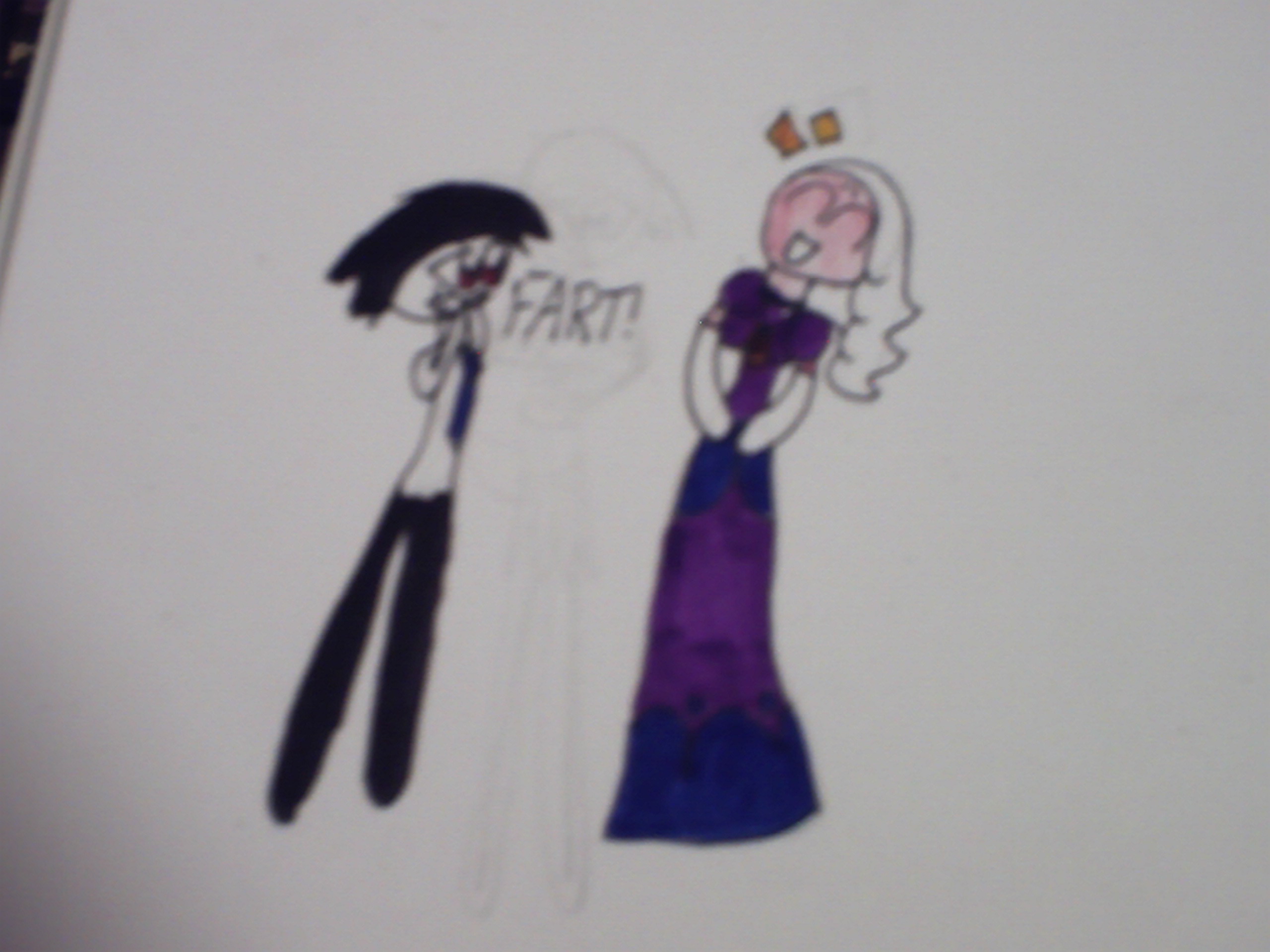 Anyway, I made a drawing to do with Queen Sam and the Shrink again. This time, he's making fart noises to make Sam laugh to try and cheer her up. It's working so far. But it won't work for long. As a TV screen, he couldn't do that. So he's taking advantage of his human form in this pic.