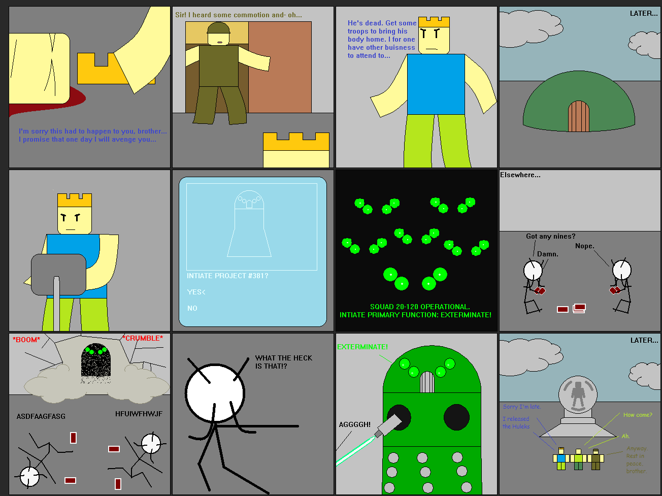 After a long time of planning, and a little time of discussion, Me and Hulaabeo decided to get rid of Lord Noob for good. Were sorry if he won't be comming back. That will be Hulaabeo's decision, not mine. So this little cartoon will be Lord Noob's final appearance. The new character btw has no name yet. If you have idea's for a new name for this person, please pm me.
