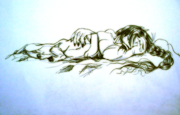 When I have a day of inspiration, I sometimes draw four or five pictures plus several sketches. Yesterday, I drew many sketches at school. Below this, Caligo and Shyridon belongs. The next three pictures will show you Shyridon from the back and from the side, crawling and Caligo sleeping.