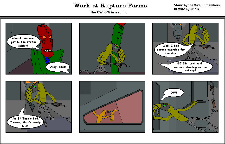 I really liked how you expressed the side of Arnie. Made me think of AE. Also, I liked you made the reflection of #7 Slig on the trains front glass. Hey, anyway, since you are always working on that comic (most of the time) don't you need another person as a Staff, Dripik?