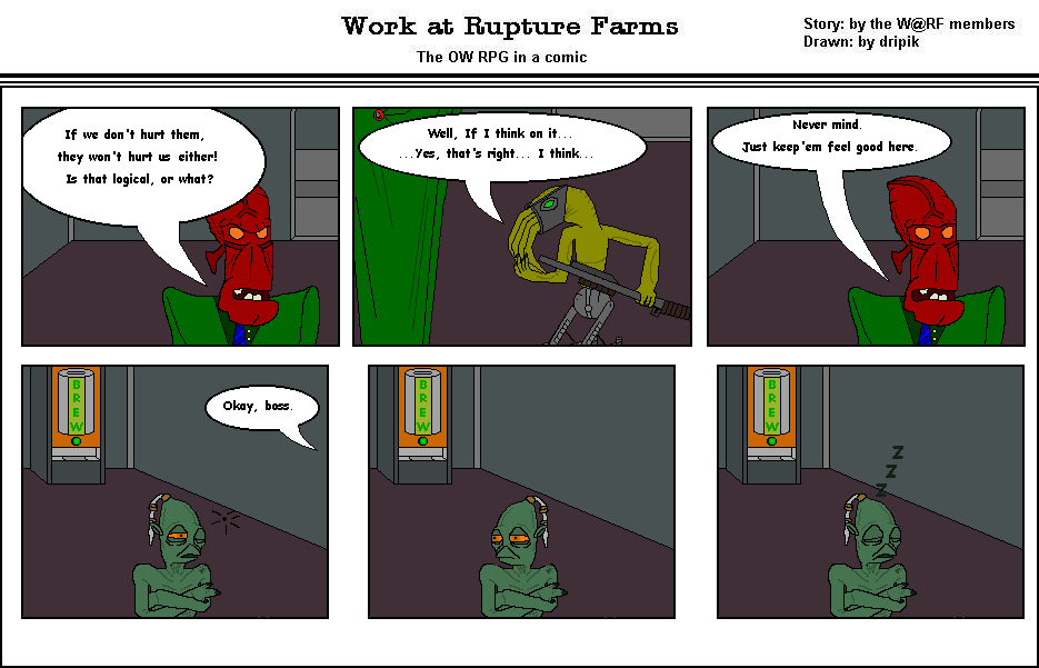 Something is messed up with this topic. I've tried to post 4 times now, and I bet this one doesn't work! As I have said 3 times before, cool comic dripik, but is it going to go right from part 1 of W@RF to Part 4, cause it'll be very long if it does.