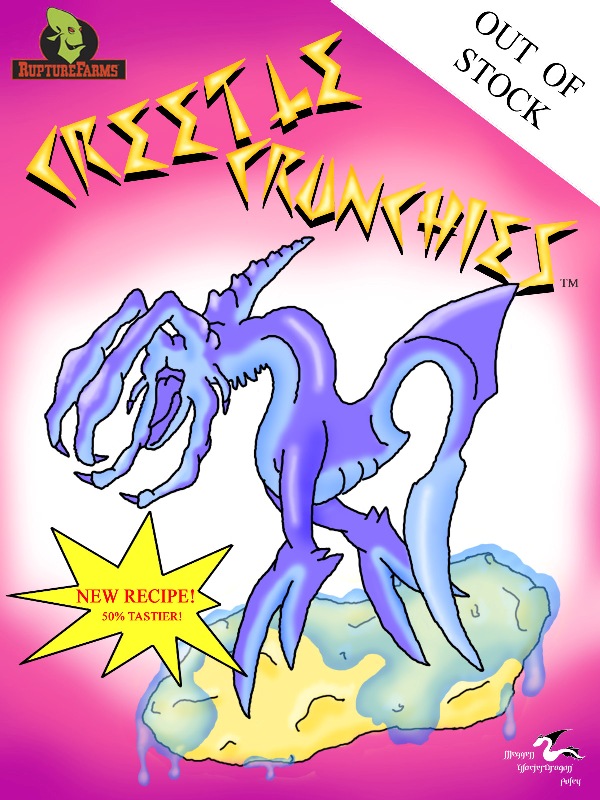 The second is a poster I made for 'Creetle Crunchies', Oddworld's favorite breakfast. The nugets are made from the exoskeletons of Creetles, filled with a jelly-like substance made from the ground-up flesh of Creetles. And if you are wondering what that blue liquid is, well it's Creetle blood mixed with a 'secret ingredient' to form a yummy syrup. I used the posters for 'Scrab Cakes', 'Paramite Pies' and 'Meech Munchies' for referance when making this.