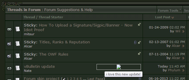 Peter finally updated the forums to vBulletin 3.8.7. A few things might have broken in the move. Please report them here. If you report a problem, please specify what theme you're using and what browser.
